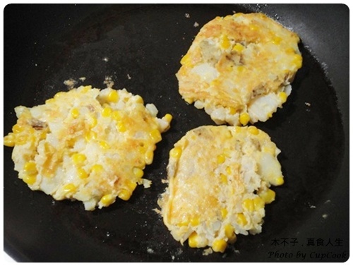 ▲ 4.平底鍋倒入橄欖油開中小火熱鍋,將玉米馬鈴薯泥用湯匙撈起放入平底鍋,並整型至表面平整。