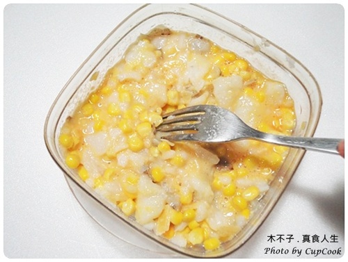 ▲ 2.沖洗過的玉米粒與切碎的起司倒入馬鈴薯中,攪拌均勻。
