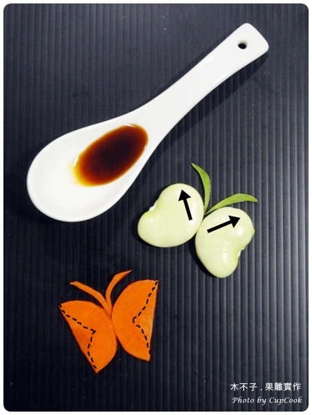 ▲ 1.準備好皇帝豆與紅蘿蔔片,紅蘿蔔片按照圖示虛線切割,並額外修剪蝴蝶觸角。皇帝豆蝴蝶的觸角可以用青蔥或是豆莢修剪。